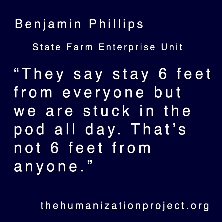 I haven’t seen my family in a while. It hurts knowing there’s no visitation. A lot of people at State Farm where I live are not working. Only a select few are working. Usually 90% are working. Now it’s like 10%. How can we get through this if only a few people can be the rest can not?