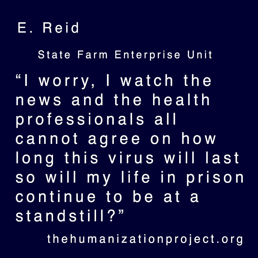 I worry, I watch the news and the health professionals all cannot agree on how long this virus will last so will my life in prison continue to be at a standstill? I have a sentence to fulfill, but will I get any type of relief since the severity of my crime will never change? In society, life a hustle where my skills can be used to support myself and assist others in this pandemic but in here I feel so helpless.